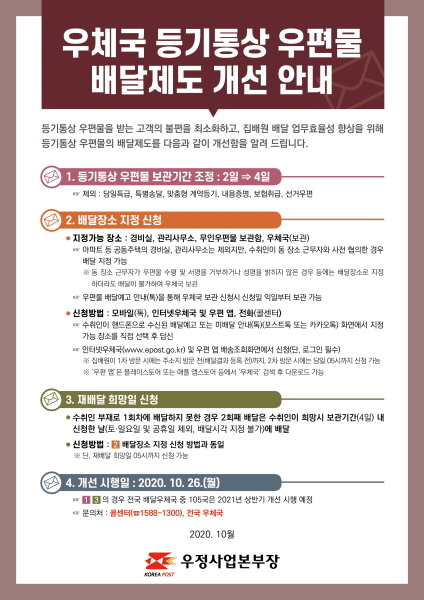 개선되는 내용은 △배달장소 지정을 통한 등기우편물의 비대면 배달 확대 △수취인의 부재로 배달하지 못한 우편물의 보관기간 2일 추가 △1회 배달하지 못한 우편물의 재배달 희망일 지정 신청 추가다.