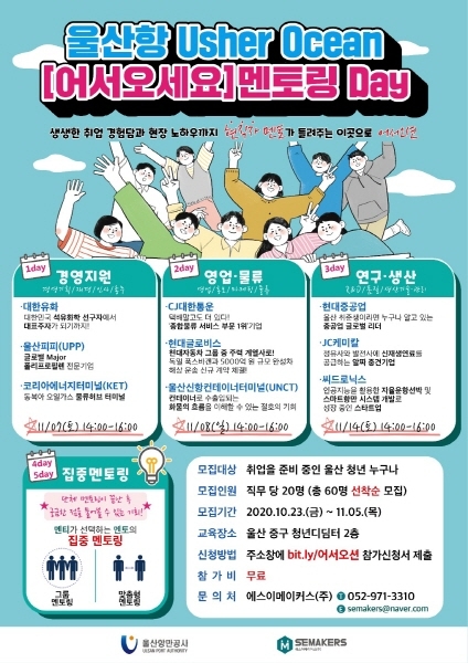 울산항만공사(이하 UPA)는 코로나19로 인해 취업정보 획득에 어려움을 겪고 있는 울산지역 청년들의 취업활동을 지원하고자 ‘울산항 Usher Ocean 멘토링 Day’를 운영, 참가자를 모집한다고 밝혔다.