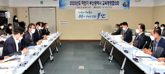 부산시교육청과 부산시가 지난 26일 오후 시청 7층 회의실에서 ‘2020 하반기 부산 교육행정협의회’를 연 가운데 양 기관 관계자들이 부산 교육 협력 사항을 논의하고 있다.