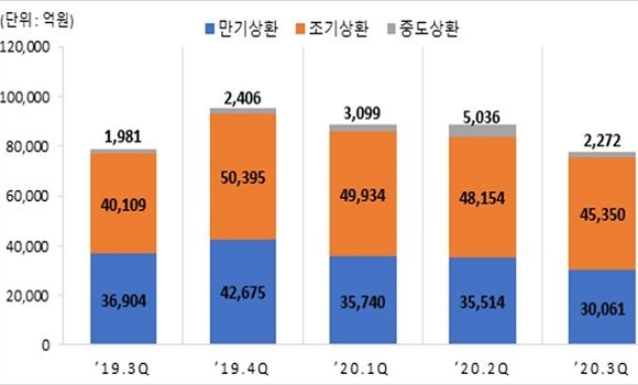 상환 유형별로는 조기상환이 4조 5350억원으로 전체의 58.4%로 가장 많은 비중을 차지했다. 이어 만기상환이 38.7%(3조 61억원), 중도상환이 2.9%(2272억원)를 차지했다.