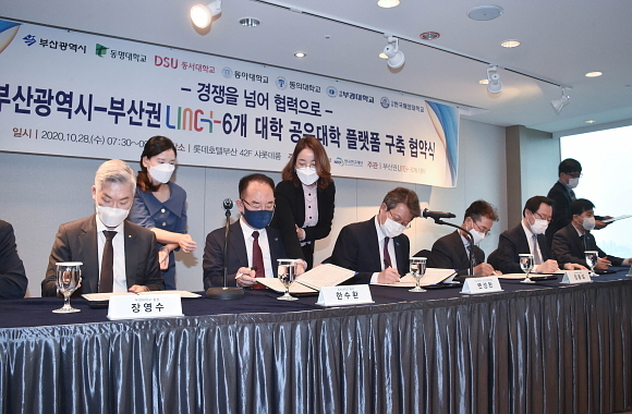 부산시와 부경대, 한국해양대, 동아대, 동의대, 동명대, 동서대 6개 대학이 28일 오전 7시 30분 롯데호텔 부산에서 ‘부산권 공유대학 플랫폼 구축 협약’을 체결했다.