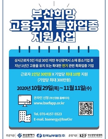 사업 지원 대상은 상시근로자 5인 이상 30인 미만의 부산 소재 전기 관련 업종 중소기업으로 1년 이상 고용유지 또는 고용을 확대한 기업이다. 시는 기업당 4대 보험료 사업장 부담금 최대 300만원을 지원할 예정이다.