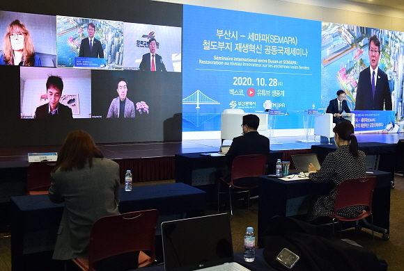 부산시가 지난 28일 오후 파리개발공사(SEMAPA, 세마파)와 공동주최한 ‘부산-세마파 철도부지 재생혁신 공동국제세미나’에서 ‘경부선 철도 직선화 등 철도부지 혁신의 회랑’ 계획을 발표했다.