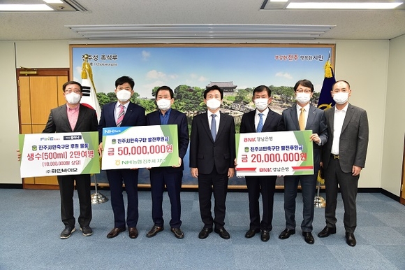 농협은행 진주시지부에서 5000만원, 경남은행에서 2000만원의 후원금을 기탁했고, 화인바이오는 진주시민축구단에 매년 생수 2만병을 기탁하여 축구단 발전에 도움을 주었다.