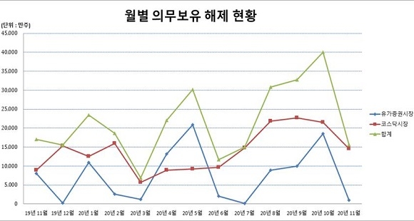 내달 중 의무보유가 해제되는 주식 수량은 전월에 비해 61.0%(2억 4445만주) 감소했으며 전년 동월과 비교하면 8.0%(1364만주) 감소한 수치다.