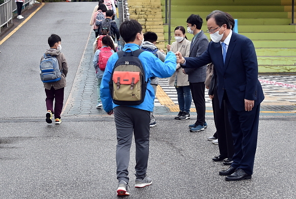 2일 부산지역 내 학교 전면 등교수업이 시작된 가운데 김석준 시교육감(맨 오른쪽)이 이날 오전 금정구 소재 동현초등학교 정문에서 등교하는 학생들을 맞이하고 있다. 오늘(2일)부터 부산지역 유·초·중·고·특수학교 가운데 1000명 이상의 과대학교와 30명이 넘는 과밀학급을 제외한 전 학교에서 등교수업을 시작했다. (사진=부산시교육청 제공)