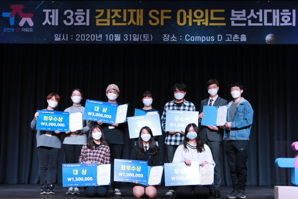 31일 열린 ‘제3회 김진재 SF 어워드’ 시상식에서 수상 학생들이 기념촬영을 하고 있다. (사진=부산대 제공)