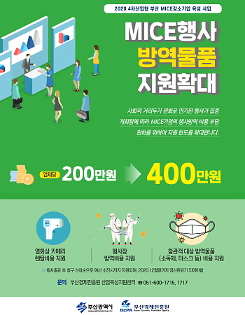 이에 부산경제진흥원과 부산시가 지역 마이스 업계에 방역비용 부담을 덜어주기 위해 업체당 최대 400만원까지 방역비 지원을 확대 시행한다고 2일 밝혔다.