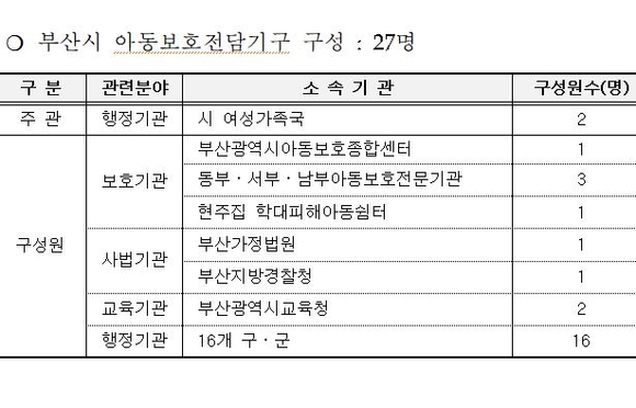 어제(2일)에는 가정법원, 경찰청, 교육청, 아동보호전문기관 등 총 25개 기관 27명으로 구성된 ‘부산시 아동보호 전담기구’의 1차 회의를 열고 기관별 대응 추진현황을 점검하고 협력사항을 논의했다.