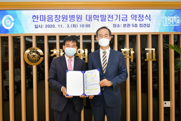 창원대학교는 3일 대학본부에서 한마음창원병원 하충식 이사장이 대학발전기금 3억원을 약정했다고 밝혔다. 이날 행사는 창원대 이호영 총장과 하충식 이사장을 비롯한 양 기관 관계자들이 참석한 가운데 진행됐다.