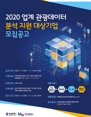 부산관광공사와 부산시가 5일부터 오는 11일까지 지역 관광업계의 관광데이터 분석 지원을 위해 ‘2020 업계 관광데이터 분석 지원 대상기업 모집’을 시행하고 있다고 밝혔다.