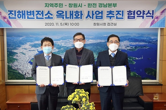 경남 창원시는 5일 시청 접견실에서 유현호 한국전력공사 경남본부장, 진해구 자은동 주민대표와 진해변전소 옥내화 사업의 원활한 추진을 위해 상호 협력 상생협약을 체결했다.