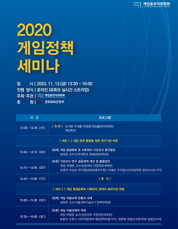 게임물관리위원회(게임위)가 오는 13일 오후 1시 30분부터 ‘2020 게임 정책 세미나’를 온라인 생중계 방식으로 개최한다고 6일 밝혔다.