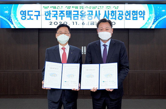 한국주택금융공사(주금공)가 부산 영도구와 함께 ‘봉래산 생태 휴식 공간 조성’에 대한 사회공헌 협약을 맺고 영도구에 사업 예산 기부금 총 1억원을 전달했다고 6일 밝혔다.