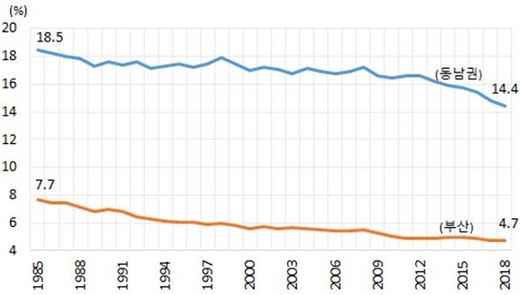 이와 함께 보고서는 1985년과 2018년의 GRDP 지역 산업별 전국 비중과 역내 비중 변화를 비교해 지역 간 산업구조 변화를 분석했다. 그 결과 부산은 지난 1985년 주요 산업이었던 제조업과 운수·창고업 등이 2018년에 와서 전국비중과 역내비중 모두 감소하며 부진한 모습을 보였다.