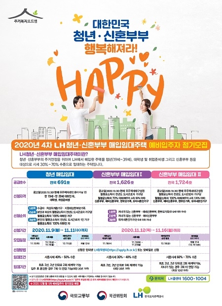 한국토지주택공사(LH)는 청년과 신혼부부 등을 대상으로 `20년 4차 매입임대주택 4041호에 대한 입주자를 모집한다고 밝혔다.