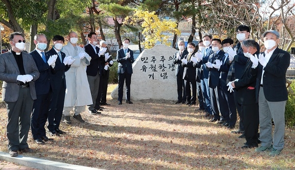 경남도가 후원한 제막식에는 민주화운동 단체와 김경수 도지사, 박종훈 교육감, 권순기 경상대 총장, 조규일 진주시장, 강석주 통영시장, 백두현 고성군수와 도의원 등이 참석했다.