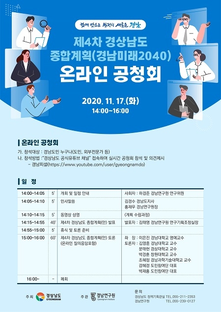 경남도가 오는 17일 오후 2시 '경상남도 종합계획(2021~2040)' 수립에 도민과 관계전문가의 의견을 듣기 위한 온라인 공청회를 개최한다.