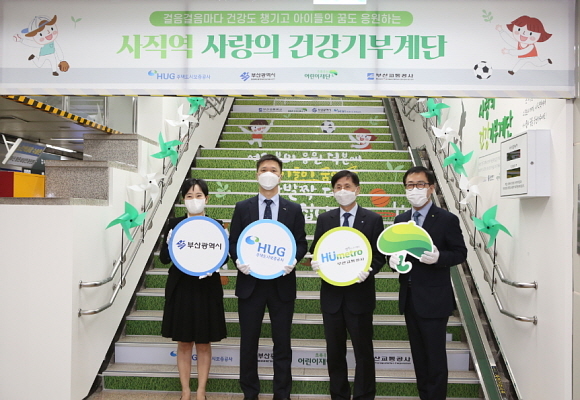 이번 건강기부계단은 HUG의 기부금, 조성비 총 1억 5000만원 출연을 토대로 부산교통공사가 역내 2번 출구 계단 공간을 제공하고 초록우산어린이재단이 시설을 설치해 조성된 것이다.