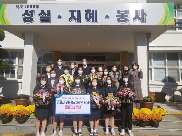경남 김해시는 지난 10일 김해여자고등학교에서 대동농협과 함께 화훼농가 돕기 고3 수험생 꽃바구니 전달 행사를 추진했다.