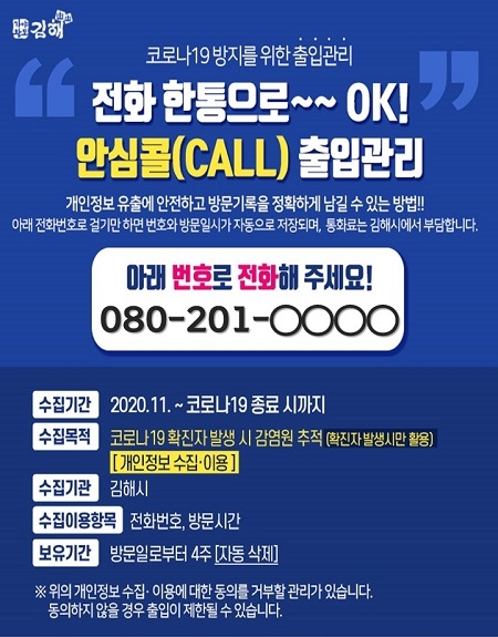 안심콜(080) 출입관리 서비스는 본인의 핸드폰으로 개별 장소에 부여된 번호로 전화하면 자동으로 방문자의 전화번호와 방문일시가 저장되는 방식으로 통화비용은 김해시가 부담한다.