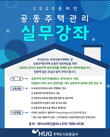 주택도시보증공사(HUG)가 공동주택 관리에 대한 실무강좌를 동영상 콘텐츠로 제작해 HUG 홈페이지에 개설했다고 12일 밝혔다.