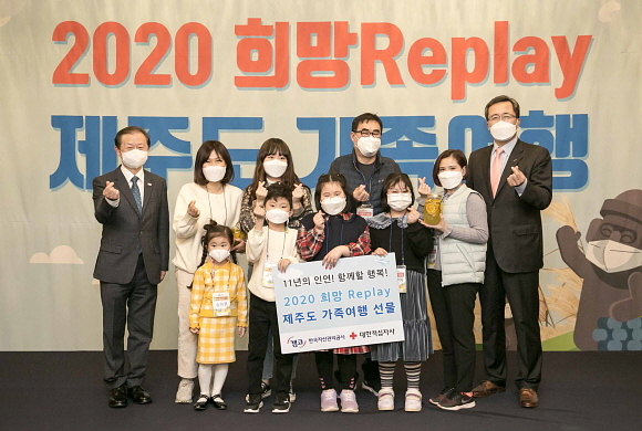 가족여행 첫날인 지난 11일에는 제주 캠퍼트리 호텔&리조트에서 ‘희망 Replay 가족여행 기념식’을 열어 문성유 캠코 사장이 신희영 대한적십자사 회장에 기부금 1억원을 전달했다.