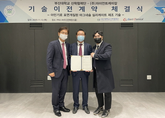부산대학교 산학협력단은 12일 오후 PNU AVEC 지하 1층 컨퍼런스룸에서 ‘마그네슘 실리케이트(규산염)의 아민기 표면개질을 통해 흡착성능을 향상시킬 수 있는 고기능성 흡착제 제조 기술’에 관한 기술이전 협약을 ㈜자이언트케미칼과 체결했다고 13일 밝혔다.