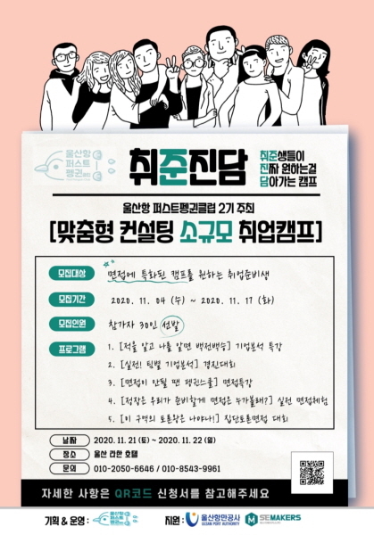 ‘취준진담’은 지역 청년들이 코로나19로 좁아진 취업의 문을 헤쳐나갈 역량을 개발할 수 있도록 지원하는 행사로, 취업준비생으로 구성된 ‘울산항 퍼스트펭귄 클럽’이 직접 기획한 맞춤형 취업캠프다.