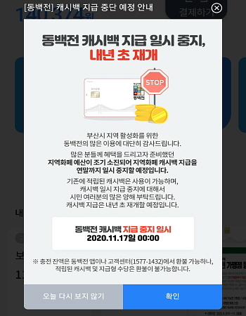 지난 9월에 이미 동백전은 누적 발행액 1조원을 돌파했으며 현재는 지난 12일 기준 1조 2000억원을 넘게 발행한 상태다. 결국 시에서는 동백전의 캐시백 예산 조기 소진으로 인해 내일(17일) 자정부터 연말까지 캐시백 지급을 일시 중지한다는 결정을 내렸다.