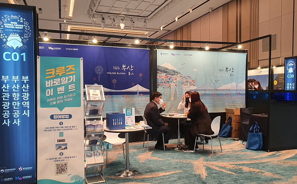 부산항만공사(BPA)가 지난 13~14일 해운대 시그니엘 롯데에서 열린 ‘2020 코리아 럭셔리&크루즈 트래블 마트’에 참여한 가운데 부산항 크루즈 홍보 부스를 운영했다. BPA 등에 따르면 이날 부산시, 부산관광공사와 공동부스를 꾸려 업계 관계자와 일반 시민을 대상으로 ‘안전한 크루즈’에 대해 설명하는 시간을 보냈다. (사진=부산항만공사 제공)