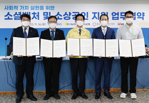 기술보증기금(기보)이 16일 충남도청 회의실에서 충남도, 하나은행, 충남창조경제혁신센터, ㈜백패커와 ‘소셜벤처 육성, 소상공인 판로 지원 협력’ 협약을 체결했다고 밝혔다.