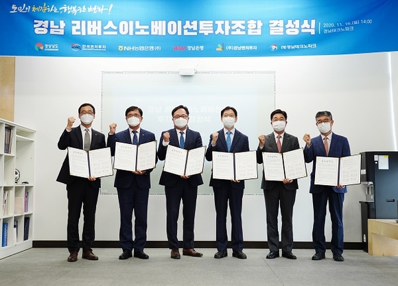경남도는 16일 경남테크노파크 본부에서 200억 원 규모의 '경남 리버스 이노베이션 투자조합' 결성을 위한 업무협약을 체결했다. 지난 10월 '한국모태펀드 3차 정시 출자사업'에 선정된 데 따른 것이다.
