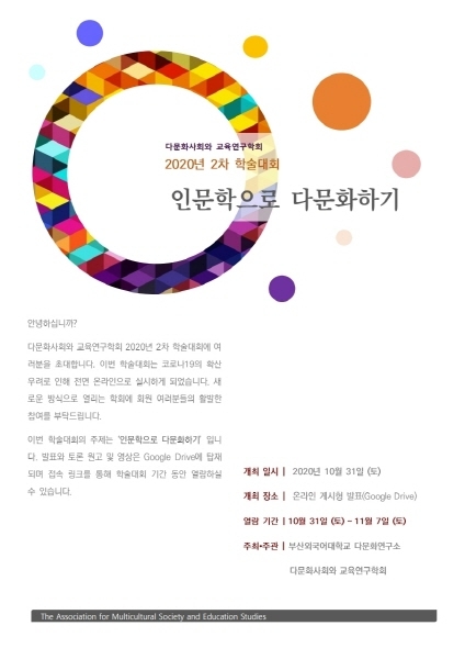 부산외국어대학교 다문화연구소는 지난달 29일부터 이달 7일까지 ‘다문화사회와 교육연구학회 2020년 2차 온라인 학술대회’를 개최했다고 밝혔다.