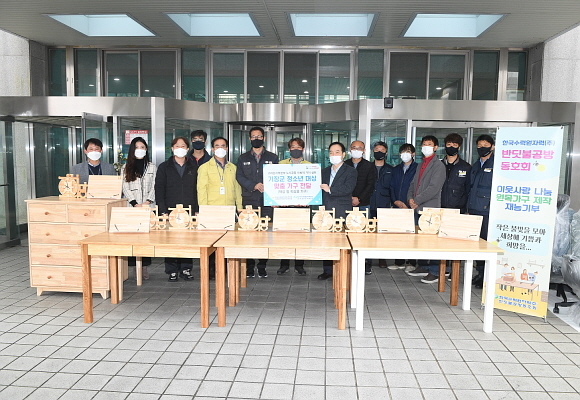 부산 기장군은 18일 ‘한수원 반딧불 공방 동호회’ 회원들이 원목으로 직접 제작한 책상, 서랍장 등의 가구를 기장군 인재양성과에 기증했다고 밝혔다.