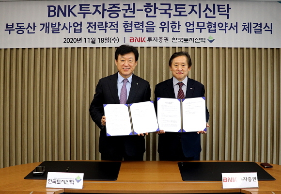 BNK투자증권이 18일 오전 부동산 개발사업 부문 강화를 위해 한국토지신탁과 ‘부동산 PF(프로젝트 파이낸싱) 사업 경쟁력 강화 위한 업무협약’을 체결했다고 밝혔다.