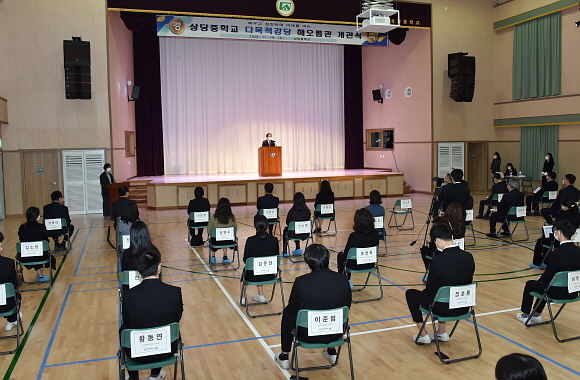 지난 18일 오전 김석준 부산시교육감이 해운대구 소재 상당중학교를 찾은 가운데 이날 열린 다목적강당 ‘해오름관’ 개관식에서 축사를 전하고 있다. 김석준 시교육감은 이날 축사를 통해 “이번 해오름관은 해가 떠오르는 것처럼 학생이 밝고 활기차게 교육활동을 하는 공간으로 만들어졌다”며 “이곳에서 학생이 자신의 꿈을 마음껏 키워나가길 바란다”고 전했다. (사진=부산시교육청 제공)