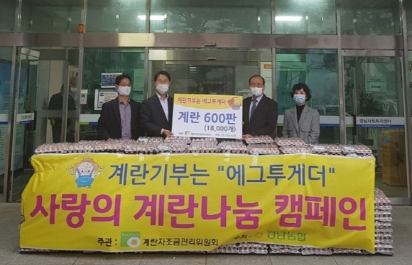 경남농협은 19일 경남사회복지센터(창원시 의창구 동읍 소재)에 계란 30구 600판(1만 8000개)을 전달하는 ‘사랑의 계란나눔, 에그투게더 캠페인’을 실시했다.