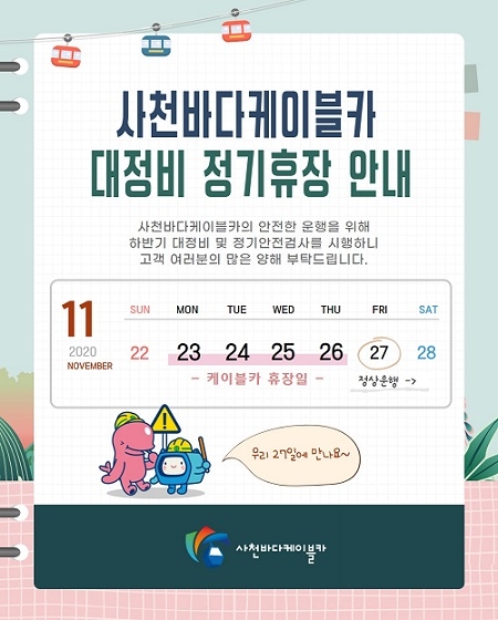 사천시시설관리공단이 사천바다케이블카 하반기 대정비와 정기 안전점검을 위해 오는 23일부터 26일까지 4일간 휴장을 실시한다.