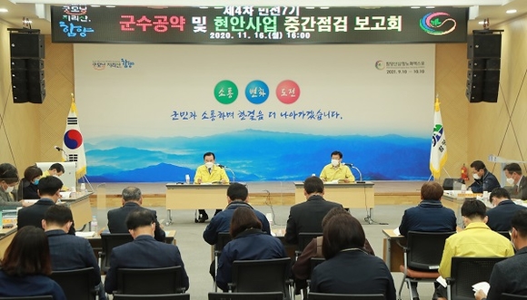 경남 함양군은 지난 16일 군청 대회의실에서 서춘수 함양군수, 해당 부서장 등 50여명이 참석한 가운데 '제4차 민선7기 군수 공약사업 추진상황 중간점검 보고회'를 갖고 추진상황을 점검했다.