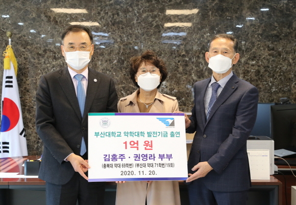 부산대학교는 약학대학 권영라 동문(약학과 71학번)이 20일 오전 교내 본관 5층 총장실에서 1억원의 발전기금을 출연했다고 밝혔다.