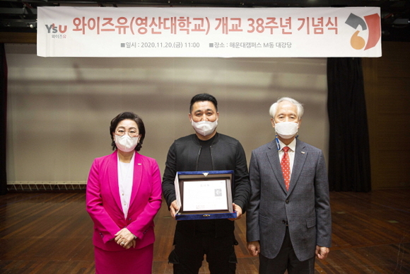 와이즈유 노찬용(왼쪽) 이사장과 부구욱(오른쪽) 총장이 대학 설립자의 일생을 웹툰작품으로 만들어 헌정한 김성모(가운데) 웹툰영화학과 교수에게 지난 20일 감사패를 전달하고 있다. (사진=와이즈유 제공)