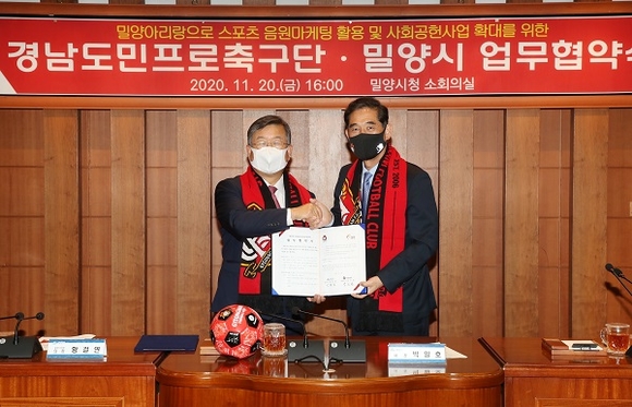 경남 밀양시는 경남도민프로축구단(이하 경남FC)과 지난 20일 시청 소회의실에서 밀양아리랑 응원가 개발 활용 및 동반성장을 위한 업무협약을 체결했다.