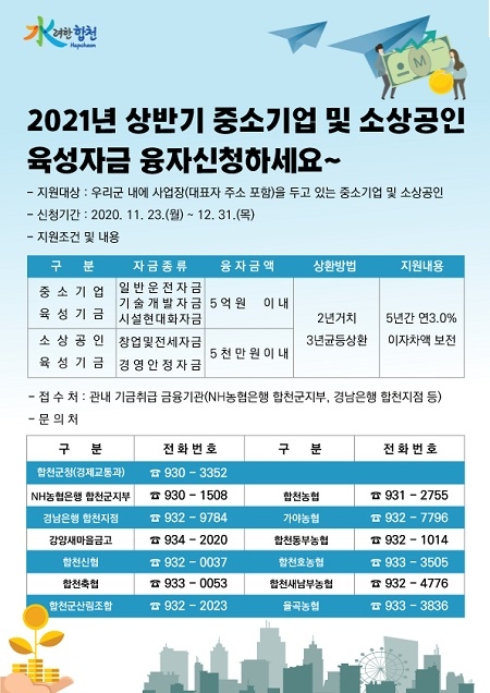 경남 합천군은 '2021년 상반기 중소기업 및 소상공인 육성기금' 융자지원 신청을 23일부터 12월 31일까지 받는다고 밝혔다.