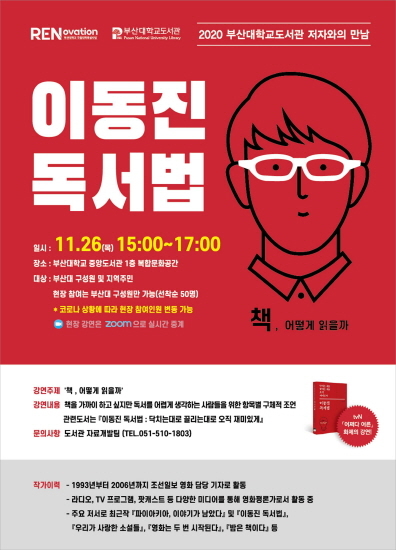 부산대학교 도서관은 오는 26일 오후 3시부터 2시간 동안 교내 중앙도서관 1층 복합문화공간에서 ‘책, 어떻게 읽을까?’를 주제로 이동진 작가를 초청해 ‘저자와의 만남’을 개최한다.