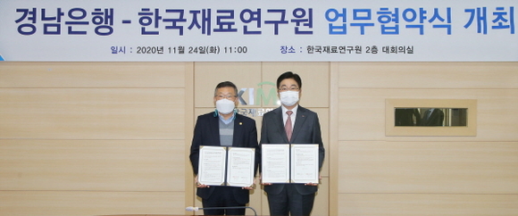 BNK경남은행은 24일 한국재료연구원과 ‘연구협력기업 금융지원을 위한 상생 협력 업무협약’을 체결했다. 이날 황윤철 은행장은 한국재료연구원을 방문해 이정환 원장과 ‘연구협력기업 금융지원을 위한 상생 협력 업무 협약식’을 가졌다.