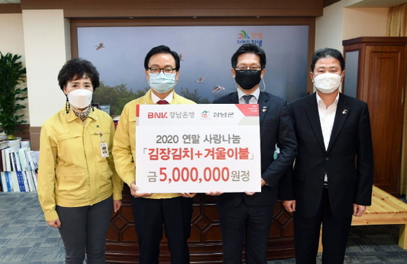한정우 군수는 “코로나19 여파가 장기화된 상황에서도 경남은행이 끊임없이 온정을 베풀어줘 정말 감사하다. 겨울을 나는 저소득 취약계층가정에 꼭 필요한 물품인 김치와 이불이 잘 전달하도록 하겠다”고 전했다.