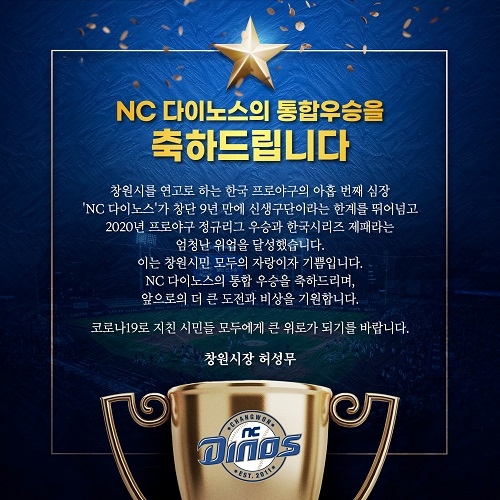 “창원시를 연고로 하는 한국 프로야구의 아홉 번째 심장 NC 다이노스의 한국시리즈 우승을 진심으로 축하드립니다.”