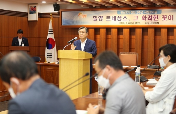 시는 지난 7월 '기업퍼스트 나노도시', '스마트 6차 농업 수도 밀양', '청정 영남알프스 관광매력도시' 조성이라는 3대 목표와 청년 친화도시 조성과 열린 시민행복 프로젝트 추진이라는 2대 중점과제를 적극 추진해 나가겠다는 민선7기 후반기 시정운영 방향을 발표한 바 있다.