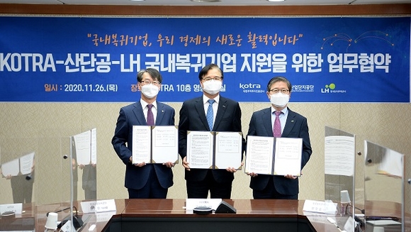 한국토지주택공사(LH)는 26일 서울 서초구 KOTRA 본사에서 KOTRA, 한국산업단지공단과 해외진출기업의 국내복귀 지원을 위한 업무협약(MOU)을 체결했다.
